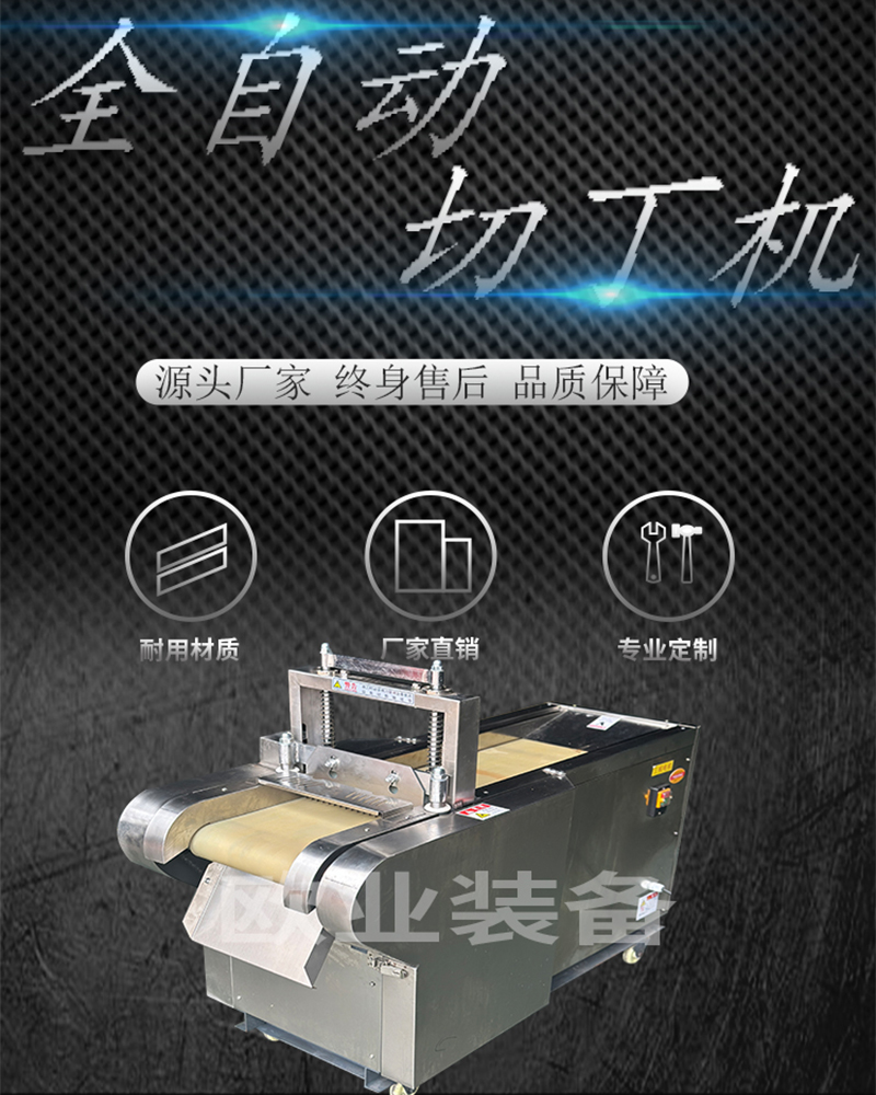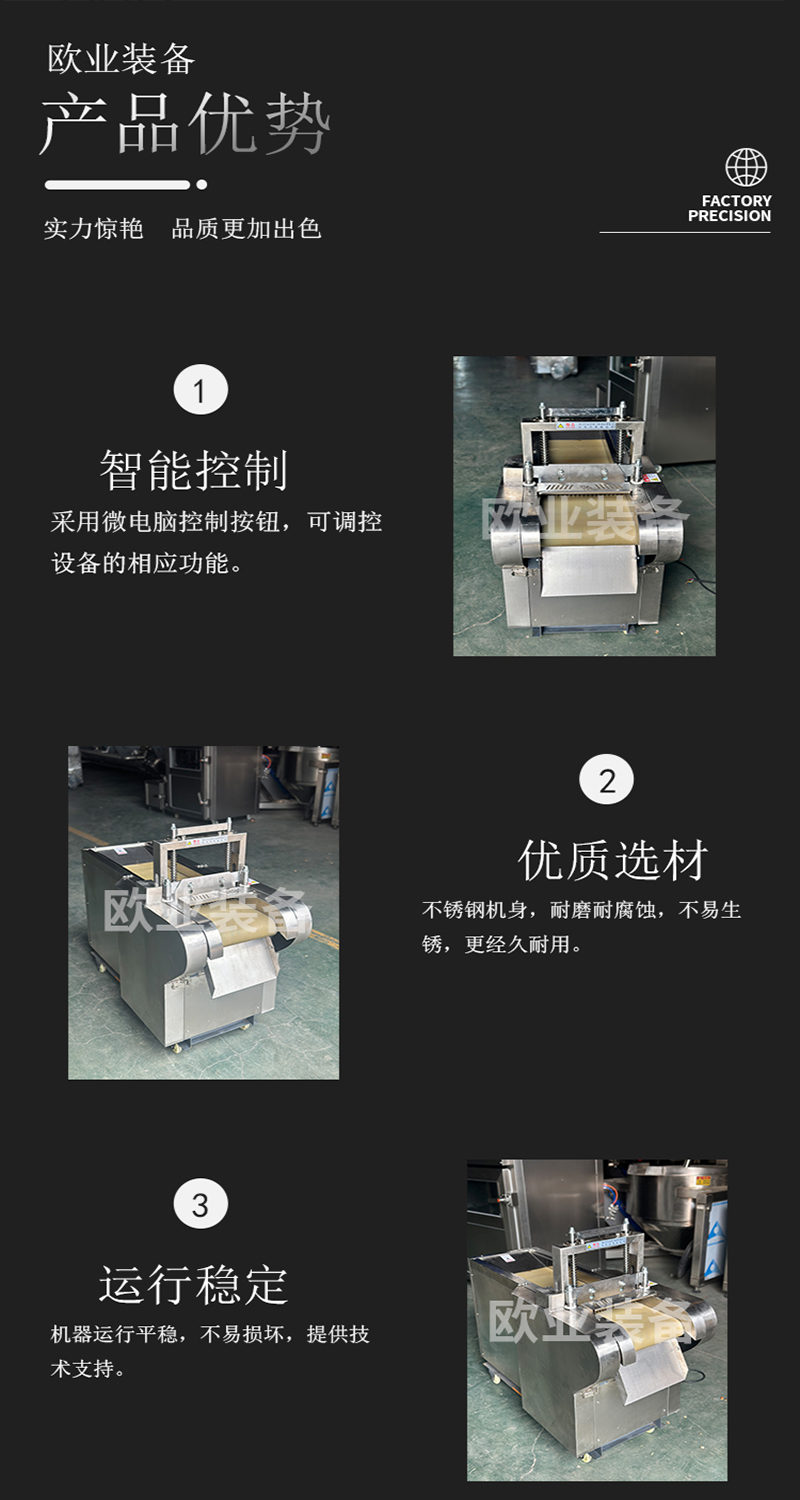 三維凍肉切丁機整機骨架采用304不銹鋼制造,堅固耐用,不生銹,安全衛生、易清洗符合食品衛生標準。設備采用三維立體切割方式,更大的避免了原料在切割過程中因擠壓造成出品率的下降,在保留原料的原始特性前提下,進行快速的切割處理工作。機結構合理,刀具均可單獨拆卸更換,大大降低養護成本。本機器可將凍肉(脂肪可切低至零下16度,瘦牛肉可切低至零下6度,豬瘦肉可切低至零下8度)切成片、條、丁。切好的產品由于仍然在凍結狀態,方便后續的包裝和配送。