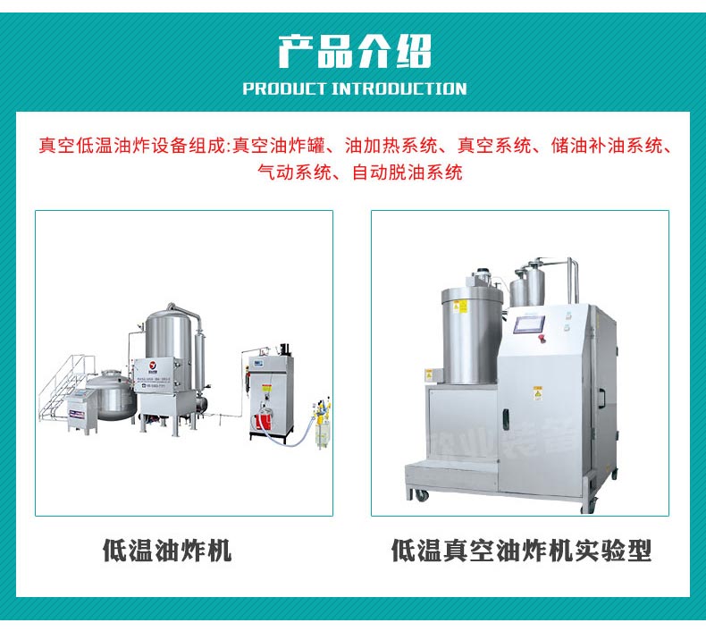 真空低溫油炸設備組成:真空油炸罐、油加熱系統、真空系統、儲油補油系統、氣動系統、自動脫油系統